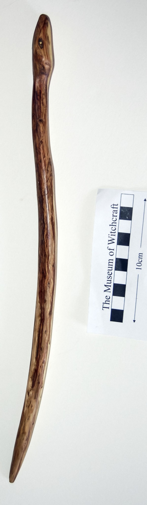 Serpent wand - a small branch carved into a snake, cleverly utilising the natural shape and markings of the wood. With glittering green metal-rimmed glass eyes.