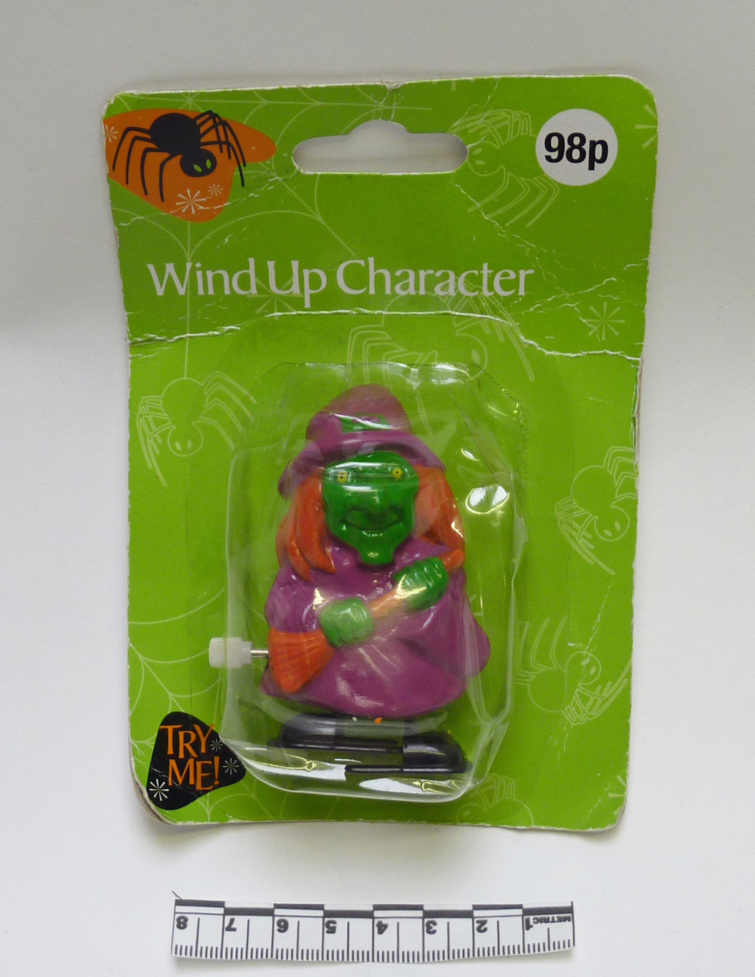 - A small plastic wind-up witch toy - obviously a Halloween toy. The stereotypical witch is dressed in purple, and has orange hair and a green face and hands. The figure is clockwork and walks when wound up. In original packaging.