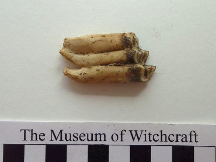 Three round pieces of holy wafer (not consecrated), with a charm written on them, fixed to a display card with an explanation of their use in magic.