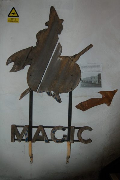 One of the more unusual artefacts that Wessex North inherited from ARCUS was a large wooden sign from a building on Corporation Street in Sheffield, removed during the demolition phase of sites along the ring road. Affectionately known as ‘The Witch’ the sign comprises a silhouette of a witch on a broomstick with the word MAGIC underneath. Discussions on local forums suggest that the sign was erected as part of a Halloween promotion advertising mattresses at ‘magic prices’. Since it was not directly relevant to the building it came from, Sheffield Museum didn’t want to add it to their social history collection. After some quick research, I found a museum in Cornwall called ‘The Museum of Witchcraft and Magic’ and I thought they might be interested in having the sign. It turns out they are! So after a long stay in the basement in the Sheffield office, she is finally flying down south to her new home in Boscastle.