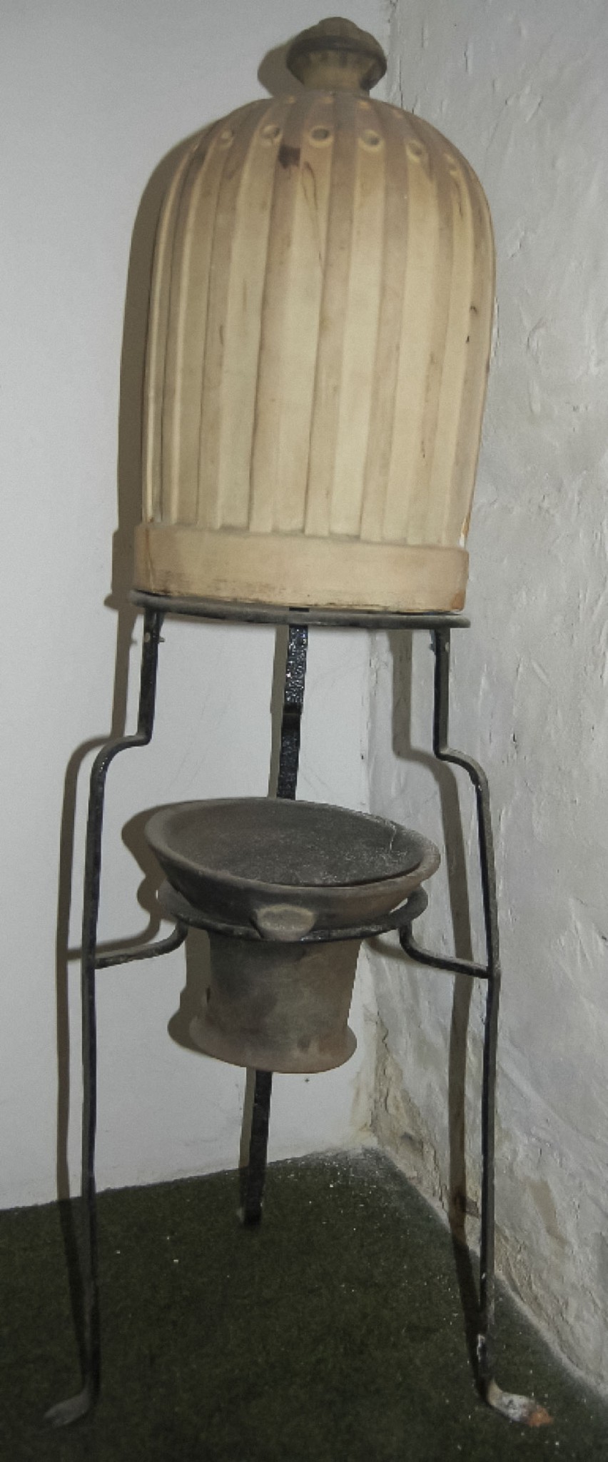 - Large incense burner consisting of an unglazed clay beehive-shape on a black metal stand, with a clay container to hold charcoal. From Charles Wade's collection at Snowshill Manor (without the beehive top which is a later addition).