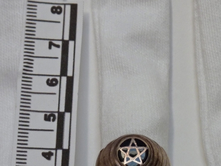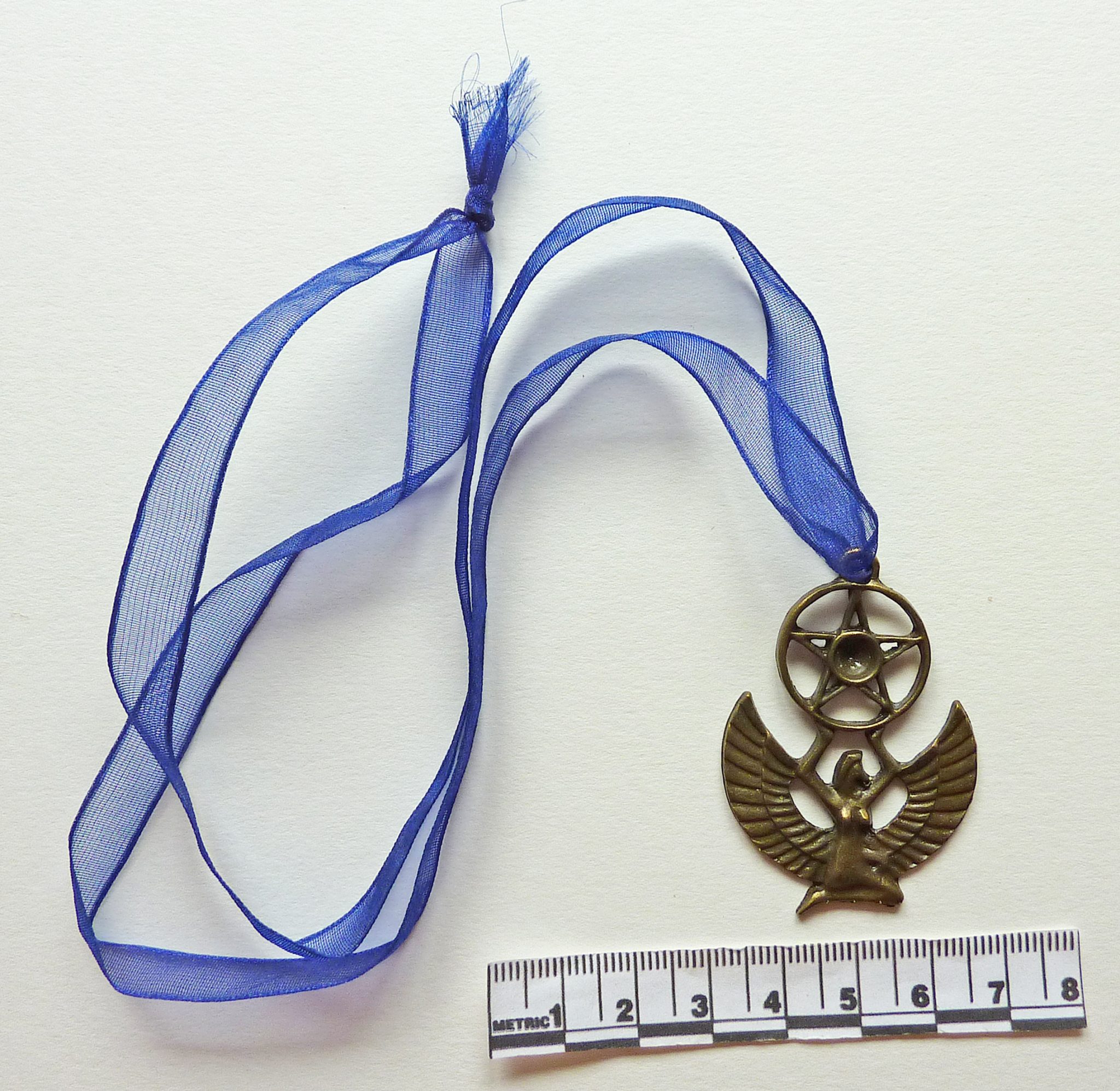 - Bronze pendant depicting the Goddess Isis, with wings, kneeling, and holding a pentacle within a circle above her head. A gemstone that would have been in the centre of the pentacle is missing. Hanging from a blue gauze ribbon.