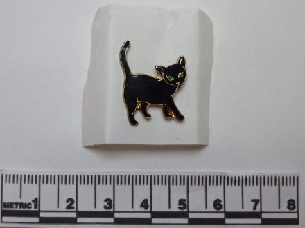 - Gold-coloured metal and black enamel brooch in the shape of a tailless Manx cat, standing in profile but with his head turned towards the viewer. He has the Three Legs emblem of the Isle of Man in gold on his side.