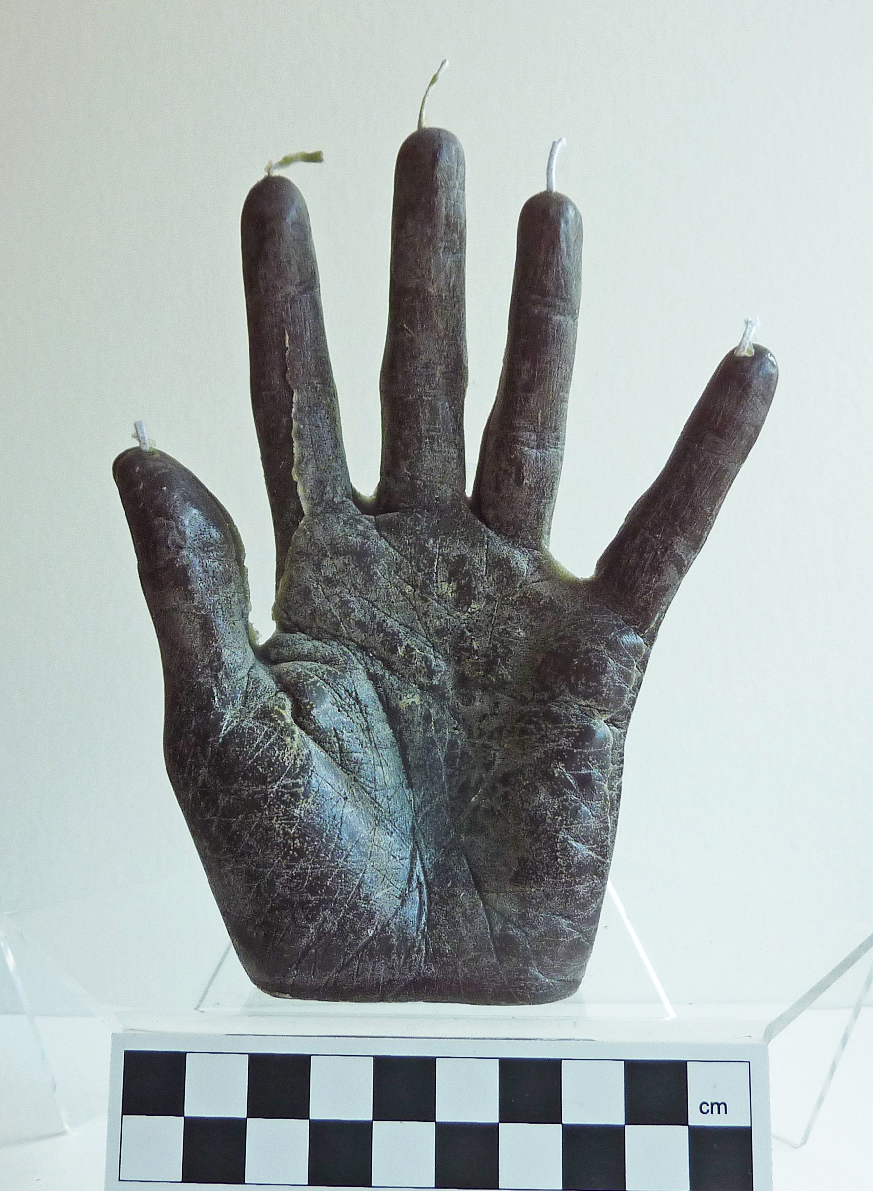 - A candle shaped like a hand, made from black/green wax.