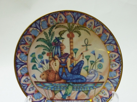 - Attractive modern plate depicting the Ancient Egyptian Goddess Hathor. The colours are subtle blues, golds and lilacs, and the goddess is portrayed in a way that combines modern naturalism with Ancient Egyptian stylisation. She is standing in the centre of the plate, wearing a horned crown and holding a sistrum.