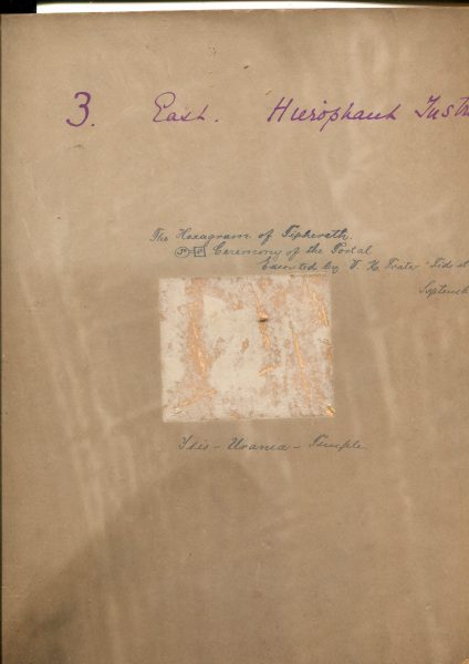 The front side has handwritten Hebrew letters and planetary symbols in black ink encased inside a yellow/gold hexagram with a blue border. The centre of the star has the symbol for the sun. Above this are the Hebrew letters תפארת, which stands (reading from right to left) for T or Th, R, A, P or F, T or Th. This appears to mean 'Glory' when translated. The top point of the star has the symbol for Saturn, then the letters זצת, Z, Aa or Ngh, T or Th. The literal translation for this appears to be 'You're quick', but this may mean something entirely different within the order or to native speakers of Hebrew. The top point contains the symbol for Jupiter, and the letters תסָז - H, S, Z. This translates to 'Concentration'. The bottom right corner has the symbol for Venus and the letters הֵצת, V, S, T. The exact translation is unclear, but it appears to mean 'Fire' or 'Ignite'. The bottom point has a moon symbol and letters יהֵנז, J, V, N, Z. The direct English translation for this appears to be 'Let's go', but again, this may not be accurate. The bottom left has the symbol for Mercury and the letters הֵוז, H, V/W, and Z. This could not be translated. The top right point has the symbol for Mars, then the letters גִּ בֵ ור הֵ, G, V, V/W, F/T, J. The translation for this is 'He is great'. On the back at the top it says in purple ink '3. East. Hierophant Instructor.' Beneath this, written in blue ink it reads 'The Hexagram of Tiphereth. 5°-6° Ceremony of the Portal Executed by the v. ho. Frater "Fide et Amore" 5° - 6° September 1910'. Below this is the wear and tear where the sticker (pictured) used to be, At the bottom of this, it says "Isis - Urania - Temple."