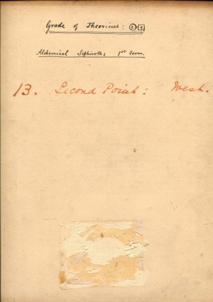 The back of the document reads in black ink 'Grade of Theoricus. 2=9', which is underlined twice and has the 2 encircled and the 9 in a square frame. Below this, it says (also underlined but only once this time) 'Alchemical Sephiroth: 2nd form'. In rust coloured ink underneath this, it reads '14. Second Point. West'. Below this, there is a mark where the label has been removed (pictured).