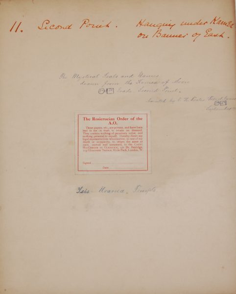 On the reverse, writing in red ink reads: "11. Second Point. Hanging under Kamea on Banner of East." Further writing in blue ink reads: "The Mystical Seals and Names drawn from the Kamea of Moon. 2=9 Grade, Second Point. Executed by V. H. Frater "Fide et Amore". 5=6 September 1910. Isis-Urania-Temple." there is also a typed label adhered to the reverse.