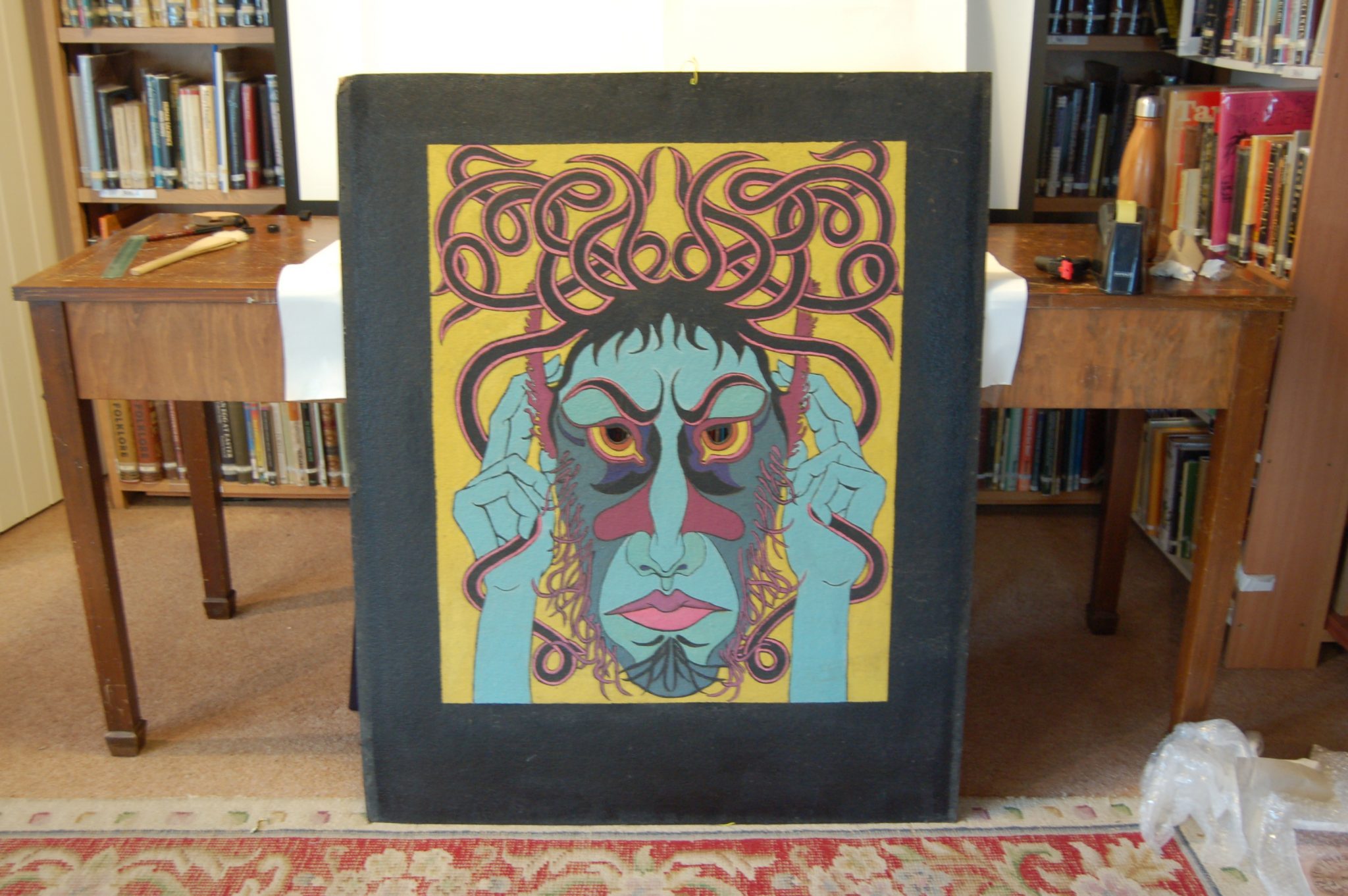 For many years, this painting was part of the Museum display "The Witch's Cradle". Originally the painting was rigged up in front of red lights that glowed in the sockets of the eyes (cut-out).
