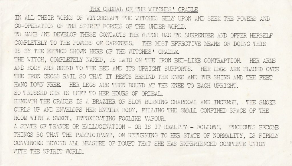 This is the description Cecil Williamson wrote of the Witch's Cradle (this is a typed interpretation card from the Museum archive - document number 7350):