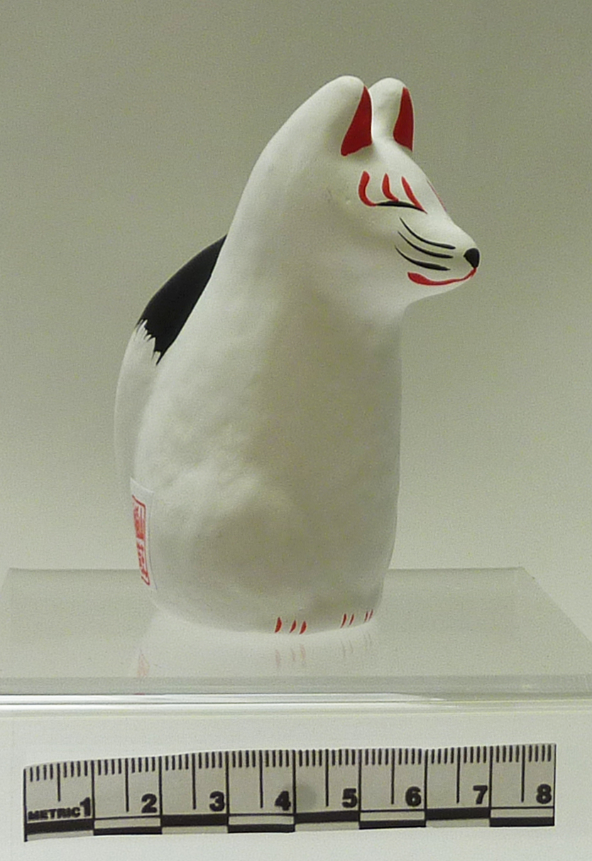 These foxes are used as offerings in Shinto shrines in Japan. The foxes are provided to worshippers for a small payment, and the person then writes a wish or prayer on the front of the fox, using a black felt-tip pen provided for the purpose. The fox is then placed on a shelf in the shrine.