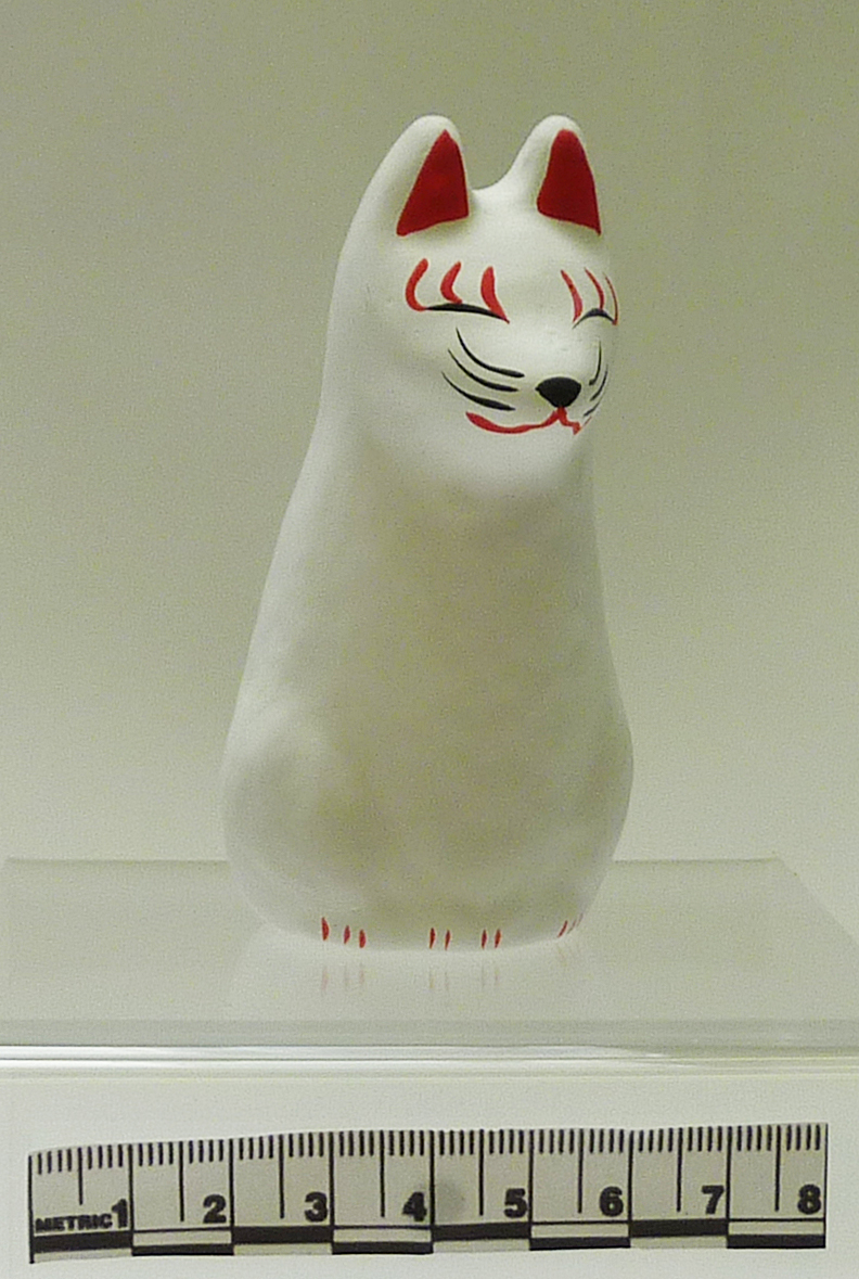 - A small plastic statuette of a Shinto white fox spirit. The fox is predominantly white, but has a black tip to his tail, red inside his ears, black whiskers and tip to his nose, and a red mouth and eye lashes. His eyes are almost closed and he has a slightly ironic smile.