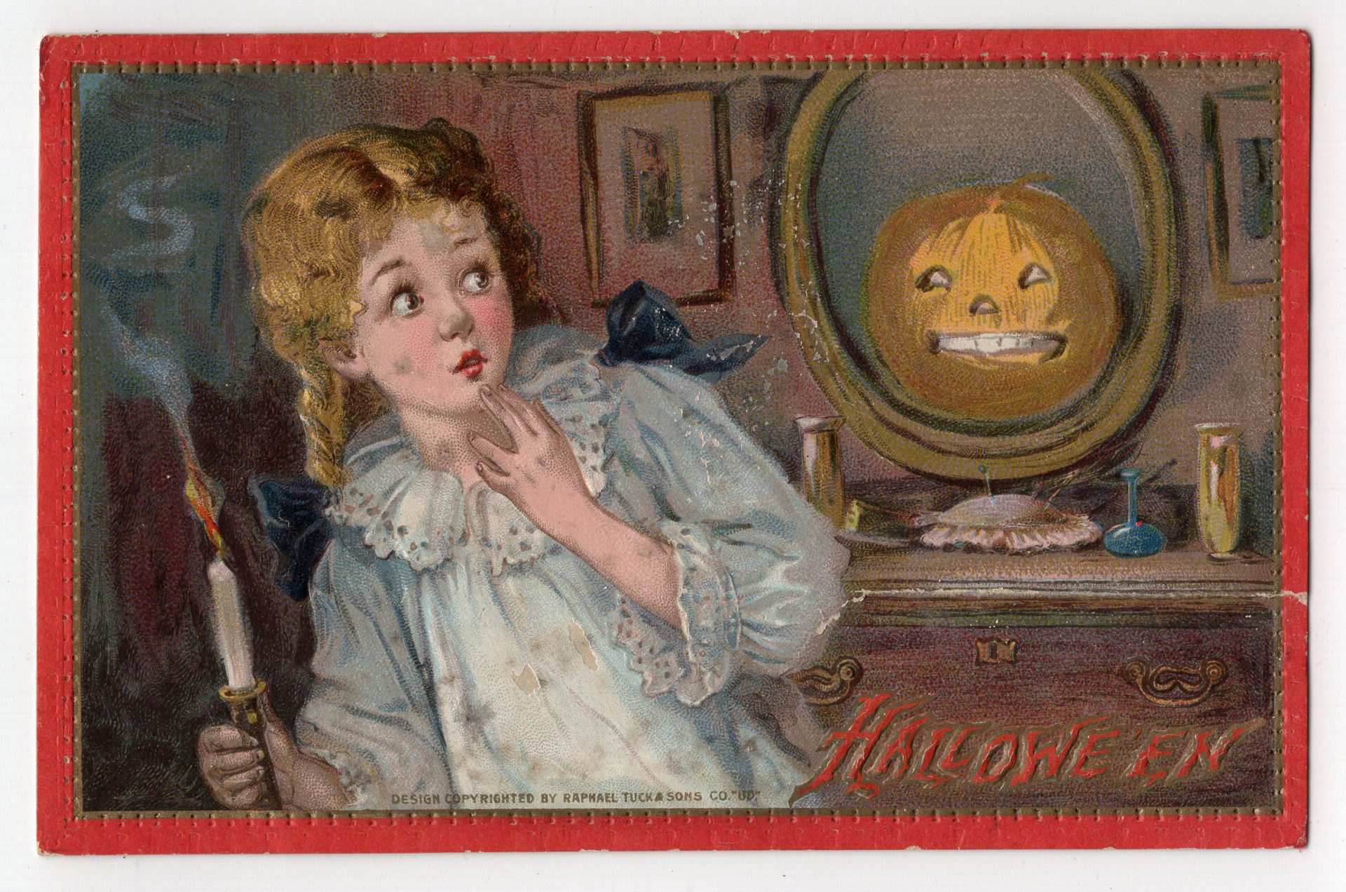 An early 20th century Halloween postcard, showing a girl looking dismayed when her Halloween mirror divination shows her a pumpkin face. The artist is Frances Brundage.