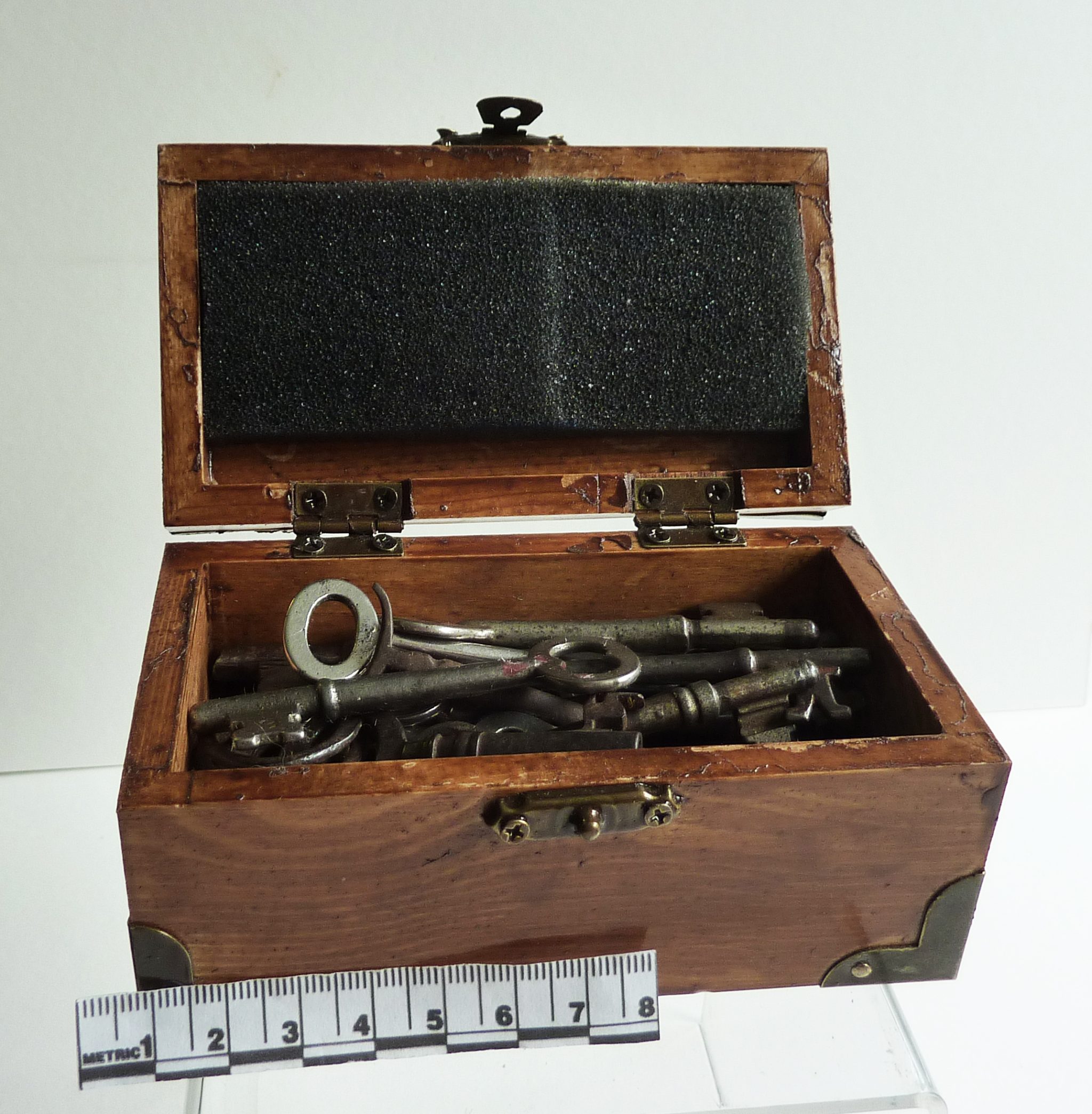 - A small wooden box, brass bound, with a slightly curved lid, containing 13 keys of various shapes and sizes.