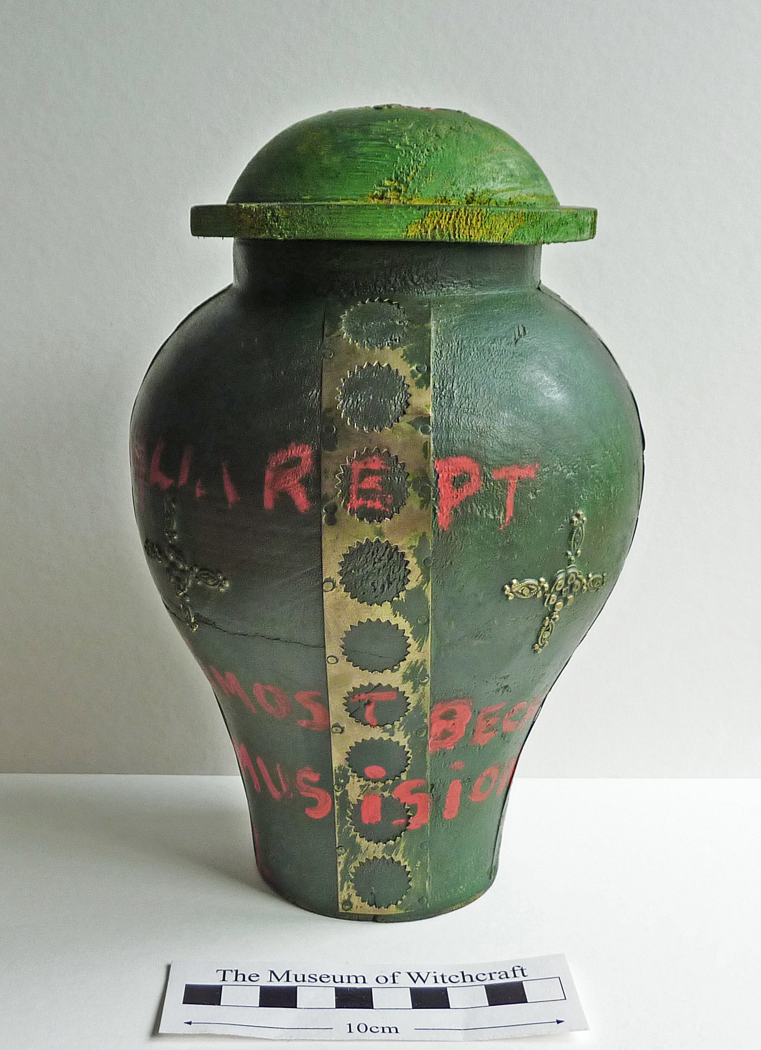- A ceramic jar in a classic vase shape, with a domed lid (sealed); the body painted dark green and the lid a lighter green. There are four vertical bands, probably made of brass, attached to the body of the jar, with ornate brass cross-shapes between them, and a similar cross shape on the top of the lid, which has a red square painted over it. There are various magical names written in red on the body of the vase and in black on the lid.