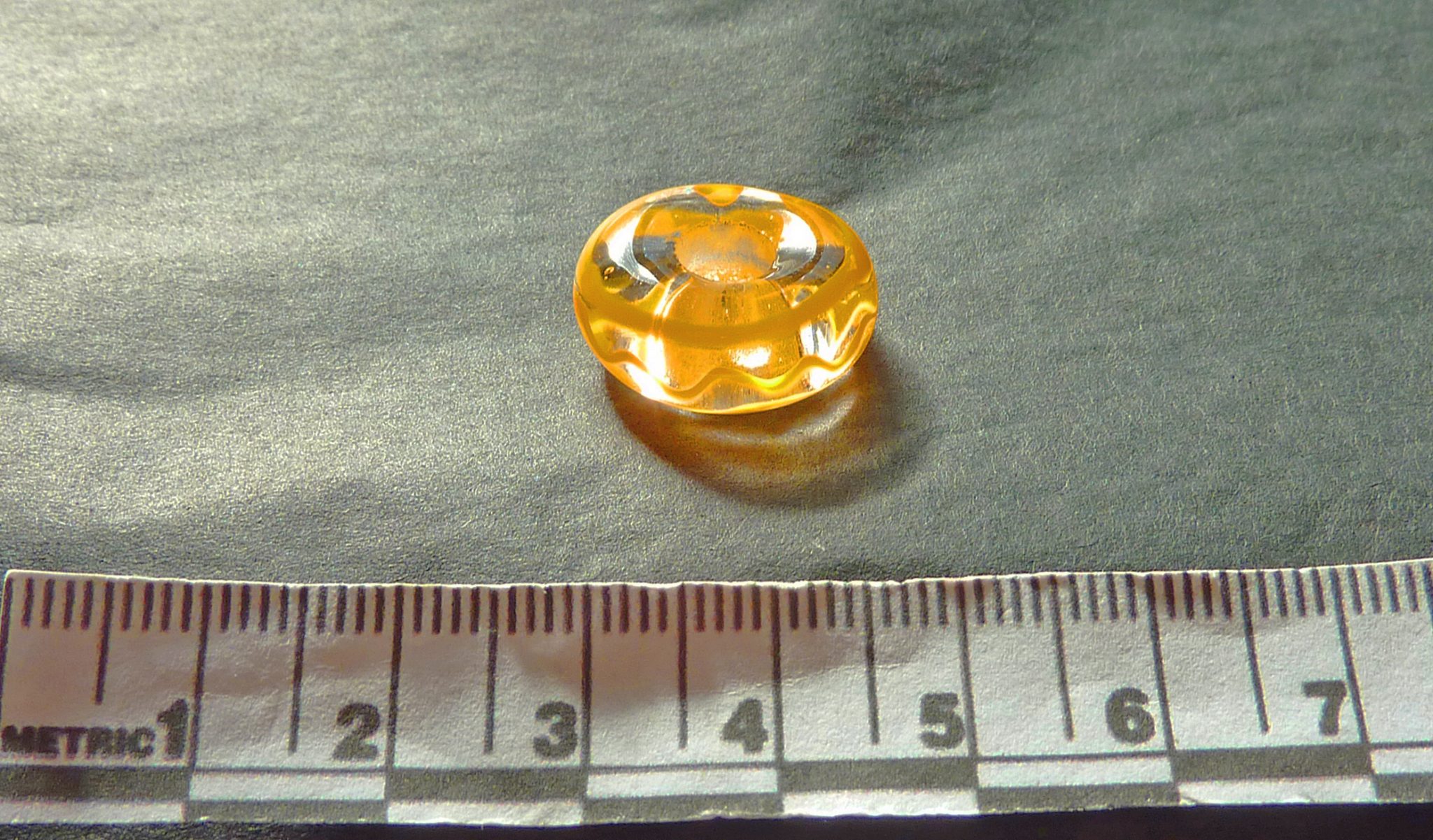 - Small clear glass bead with two orange stripes and a zigzag line between them.