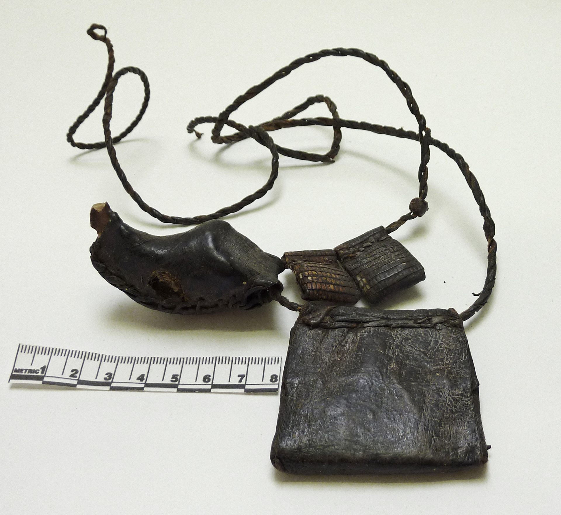 - An amulet consisting of three charm bags and a tooth or claw encased in leather. The end of the tooth/claw is protruding from the leather wrapping. There are two smaller charm bags, which appear to be made of snake skin, and a larger one of dark coloured leather with a barely visible pattern embossed on it. They are all joined together by a twisted leather thong, so that they could be worn around a person's neck.