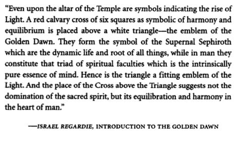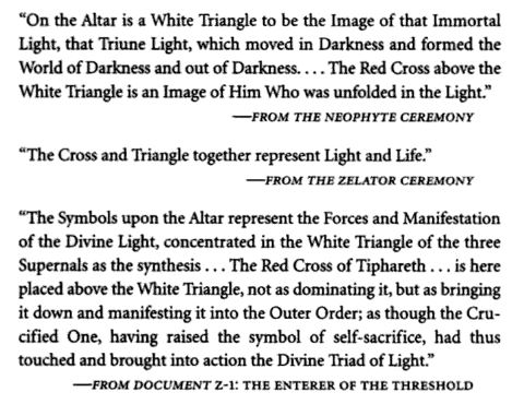 The true symbol of the Golden Dawn is the red cross above the white triangle. These emblems represent the forces and manifestation of the divine light, concentrated in the white triangle of the Supernals as the synthesis. The red cross of Tiphareth is placed above the white triangle, not to dominate it, but to cause it to descend and manifest into the Outer Order. The cross and triangle represent life and light. (source)