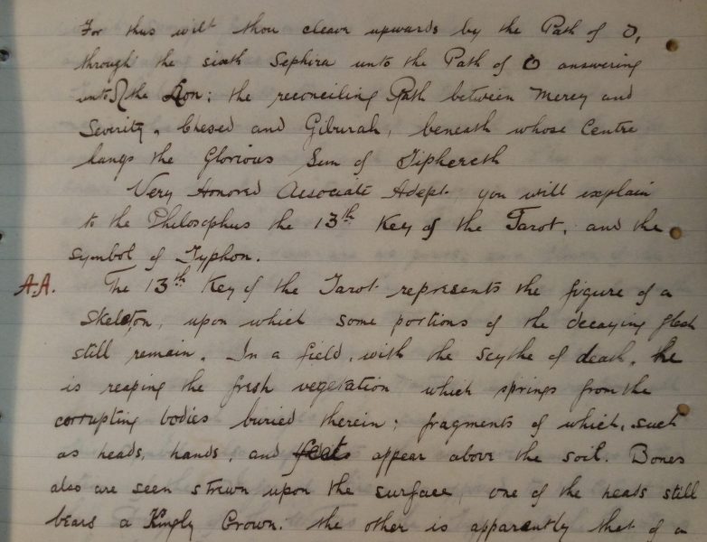 A handwritten manuscript, detailing the initiation rituals of the Order of Alpha et Omega (also known as The Golden Dawn). The content refers to the Tarot-inspired tracing board diagrams, which can be found under the Alpha Omega tag. Most likely created by the same person who created the tracing board diagrams - Frater "Fide et Amore", also known by his real name George Edwin Bance. The particular objects this manuscript refers to include: 3907, 3914, 3909, 3912, 3911, 3896, 3893, and 3895. Further scanned pages from this manuscript can be found in the aforementioned object descriptions.