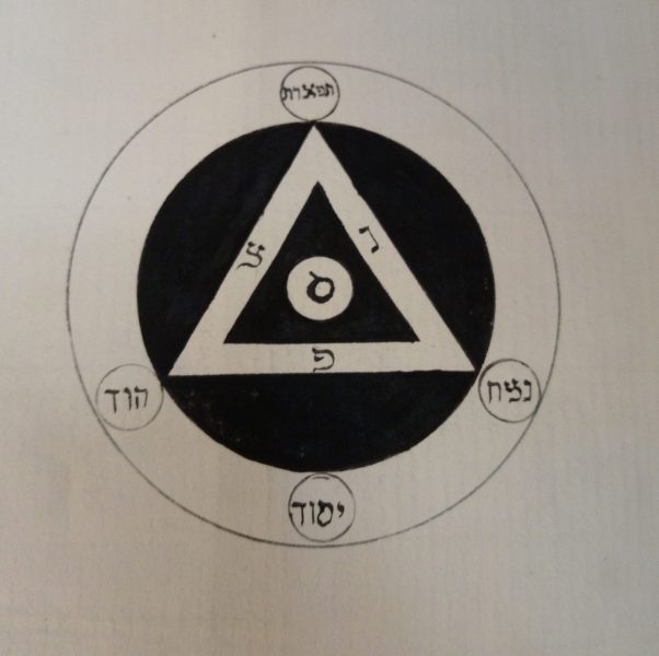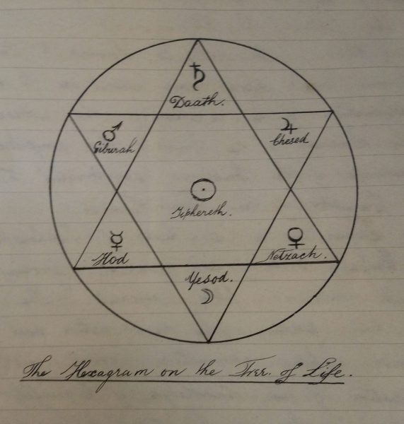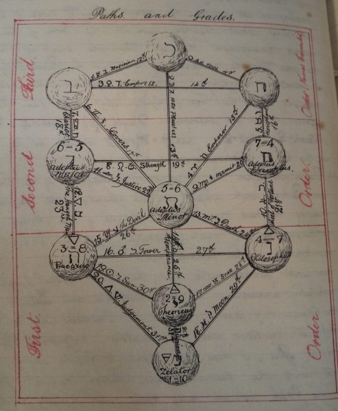 Inside, on the first page there are pencil markings of a number equation and some Hebrew letters. The first page which contains ink writing refers to The Ritual of the Portal of 5=6. The following pages describe the initiation procedures into the higher levels of the Order. The manuscripts suggests that the tracing board diagrams were used during such initiation rituals by members of higher grades, to be explained by members of lower grades whose knowledge was being tested in order for them to pass further up the grading system. The following picture illustrates an example of this.
