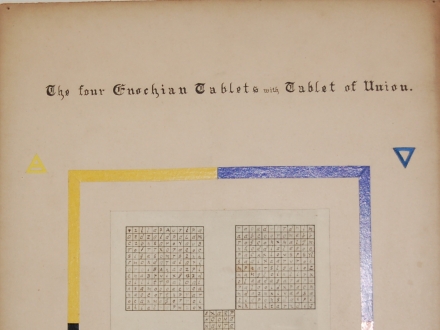 On the reverse there is another kamea of the corresponding numbers in Hebrew, and writing in black ink which reads: "The Kamea of the Moon. 2=9 Grade of Theoricus. Second Point.Isis - Urania - Temple."  Isis Urania Temple was originally the first temple of the Hermetic Order of the Golden Dawn, founded in 1888 in London.
