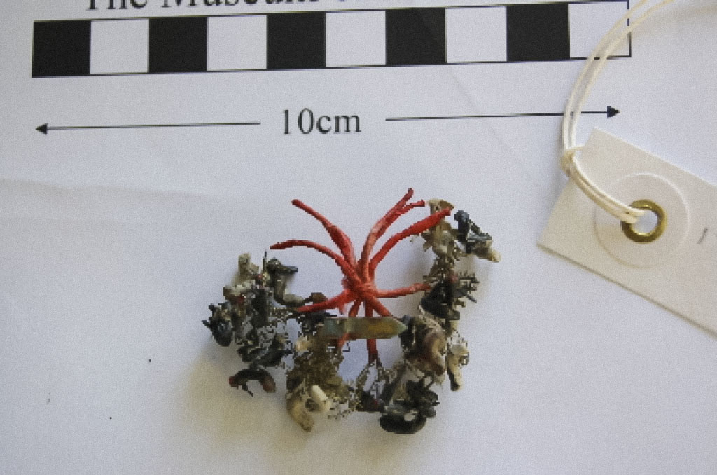 - Amulet (?) consisting of tiny metal springs bound at one end with red paper and tipped at the other with bits of a hard substance (some white and some black) resembling coral, but probably clay, as it seems to be just pushed on to the springs.