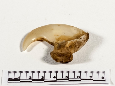 - Pendant made from a claw, probably feline, with a brass suspension ring attached to the top by an iron rivet.