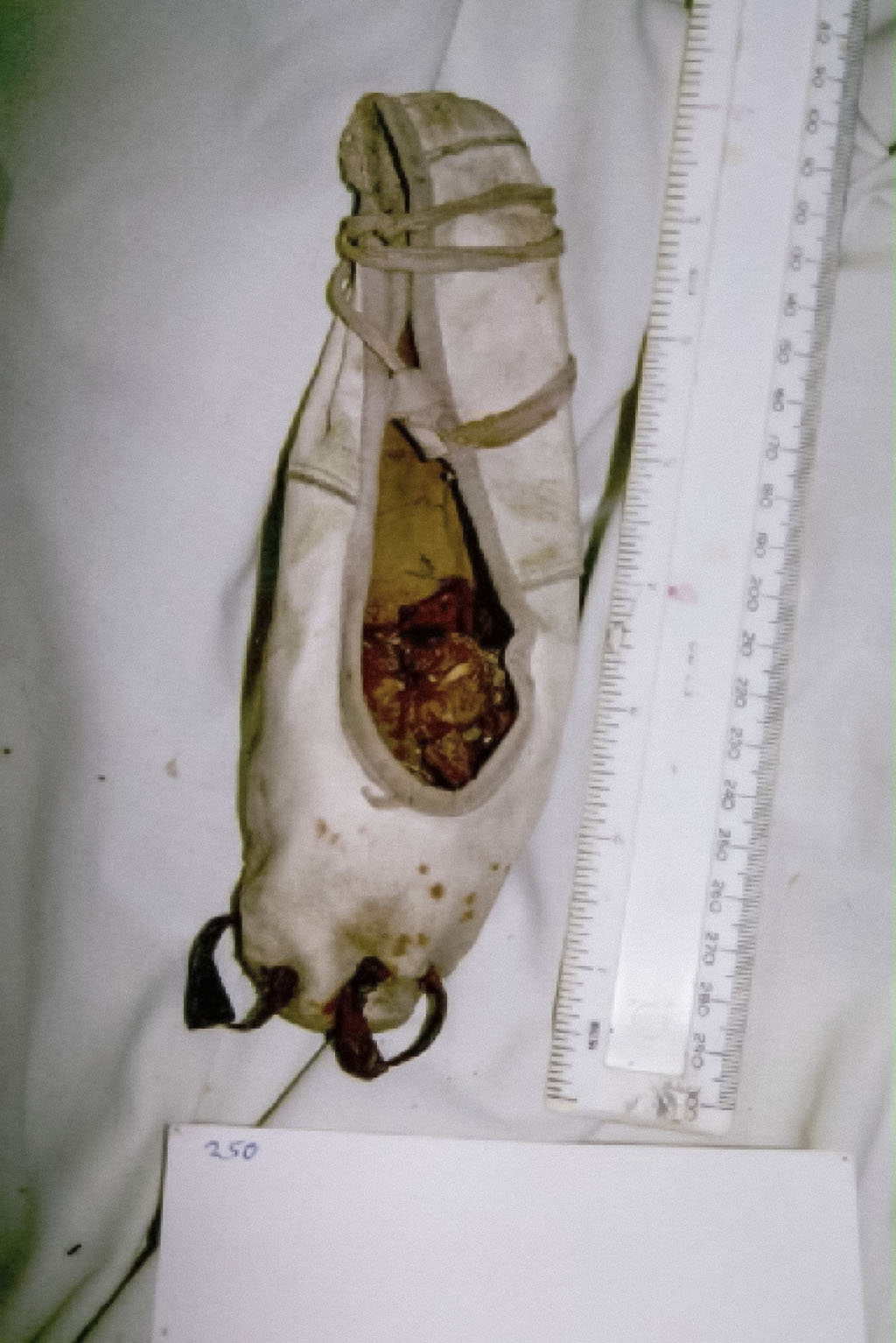 Child's ballet shoes stuffed with burrs and pierced with two horseshoe nails formed into a circle, a case of hurting and crippling image magic.