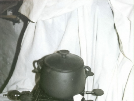 - A group of objects consisting of: a brass candlestick with a wide base with a handle (the kind designed so that it can be carried safely), with the remains of a candle still in place; a quite large and heavy brass bell with a turned wooden handle; a small Bible; and a small skull made of metal (copper?) painted white (the paint has discoloured slightly to pale cream).