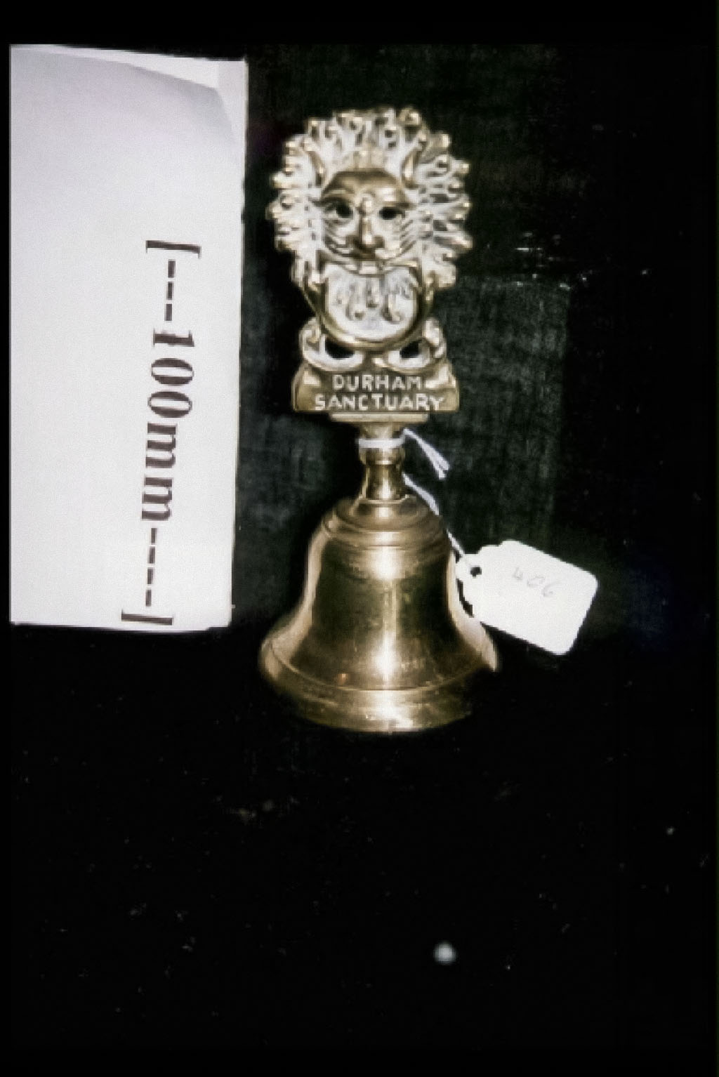 Brass souvenir bell from Durham cathedral, with the design of the famous 12th century sanctuary knocker - a feline head with a sun disc behind.