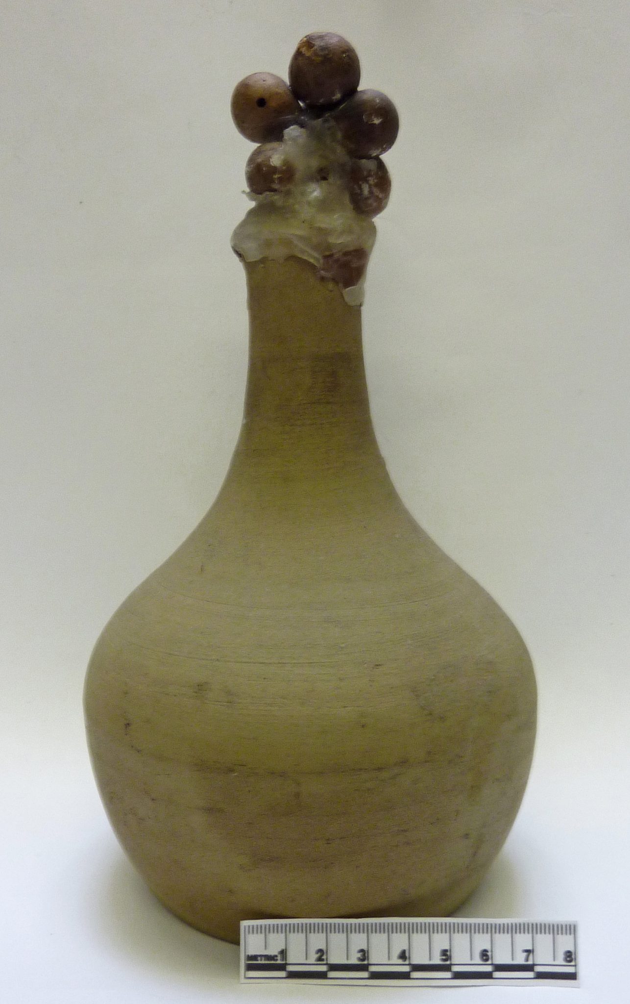 - Stoneware charm bottle sealed with wax, with seven gall nuts on the stopper.