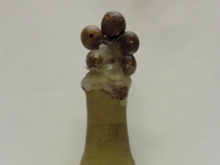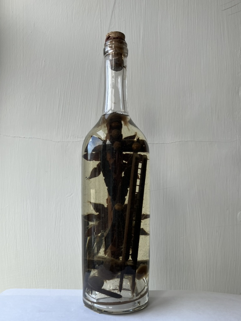 - A glass wine bottle filled with liquid and objects relating to the Passion. A wooden cross with nails, spear and ladder.