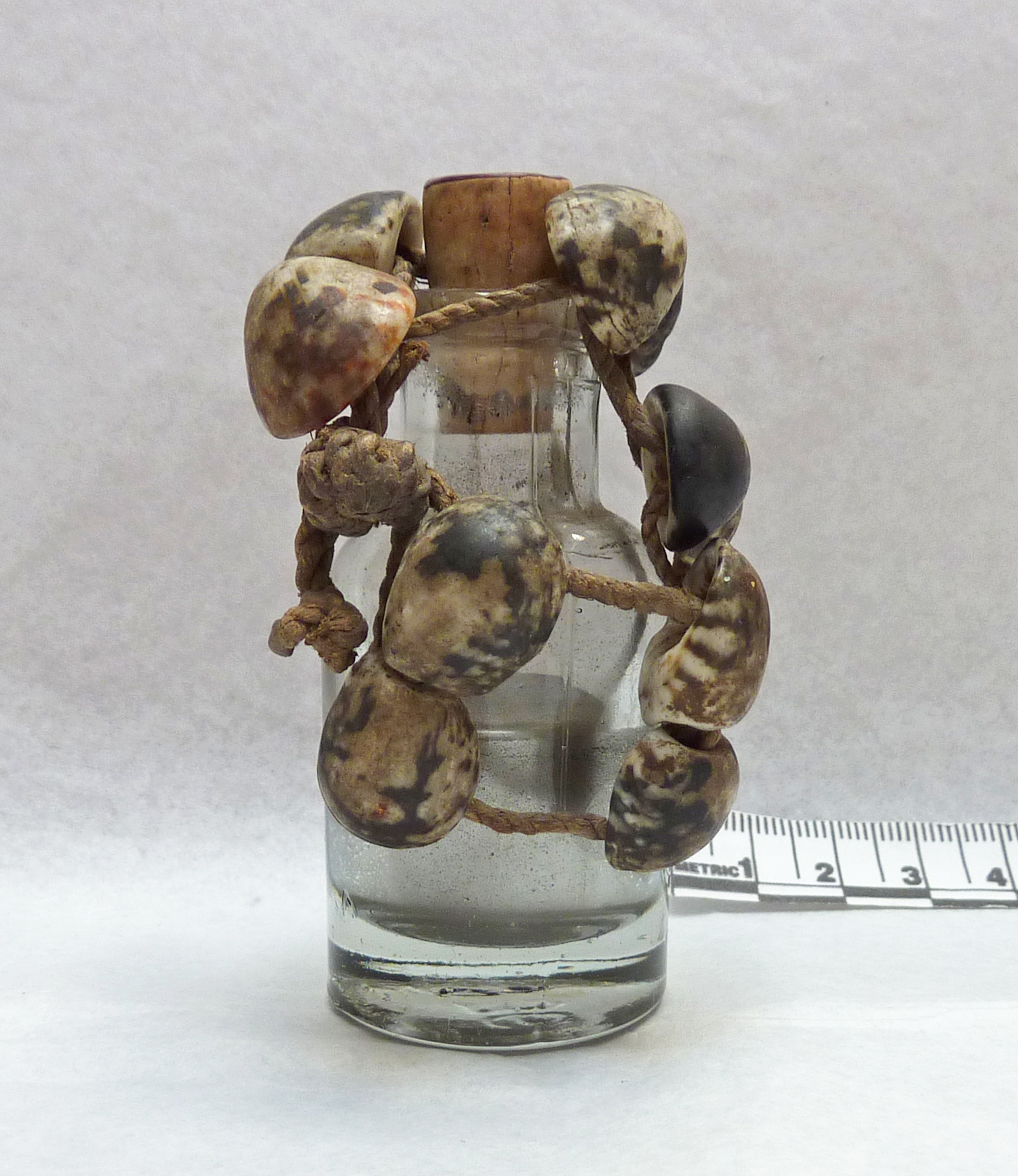 - Small glass bottle half full of mercury and decorated with shells on string.