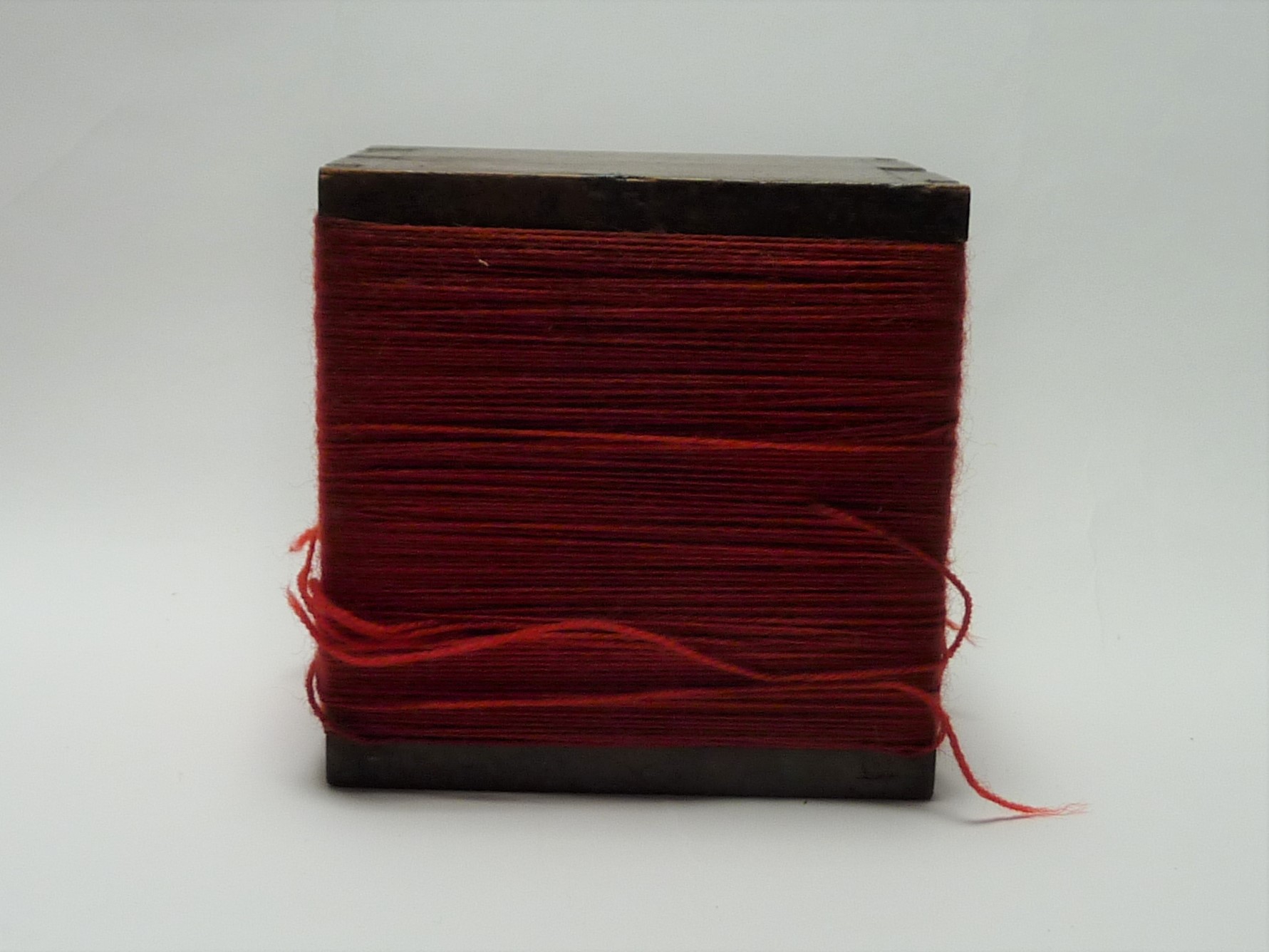 Original text by Cecil Williamson: 'Hand made wooden box bound with bright red wool. The hallmark of Jane Langdon of Nanpean. Famous 'get-lost' boxes.'