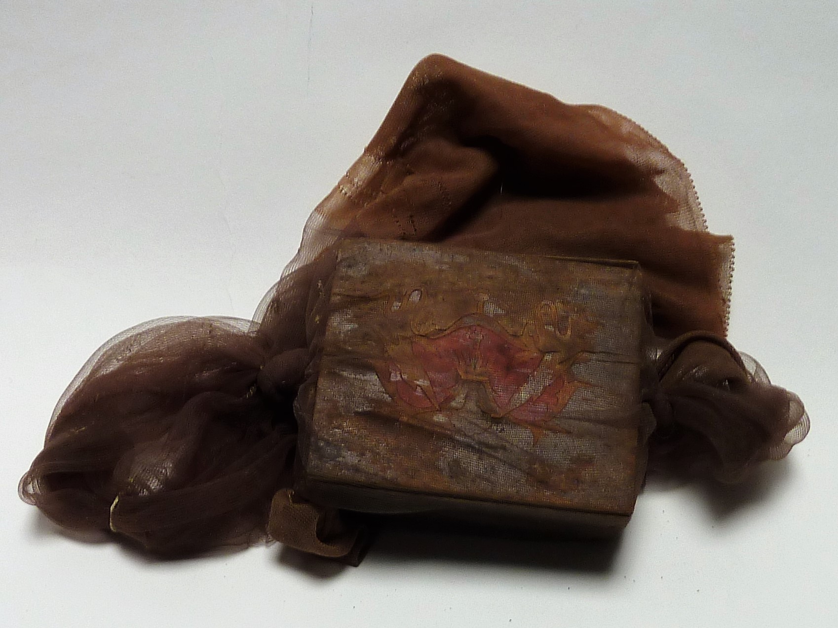 Some Swiss visitors told us that a method of curing illness still used in Switzerland consists of the sick person putting a piece of rice paper in their mouth, visualising the illness passing from them into the paper, then putting the paper into a wooden box and putting the box on the fire.This object was damaged in the 2004 flood, with the joints of the box coming apart, and the veneer separating from the wood. As a result the contents of the box are free to escape. The box is also still dirty with the very fine mud that was deposited during the flood, as it is impossible to clean it without also risking removing some of the box's contents.