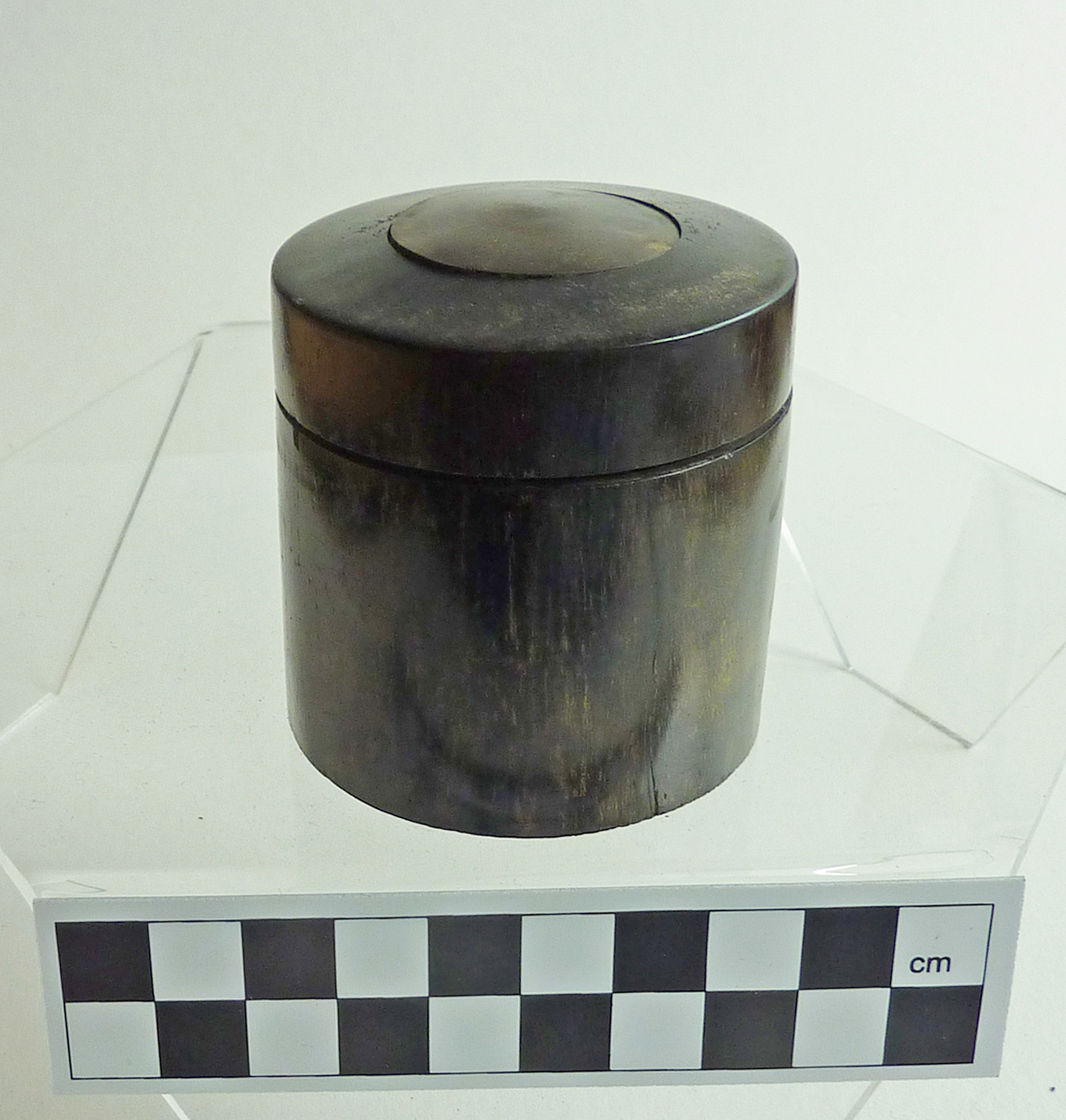 - Small round box made of very hard black wood. The lid has a disc inlaid in the centre, made of a different wood.