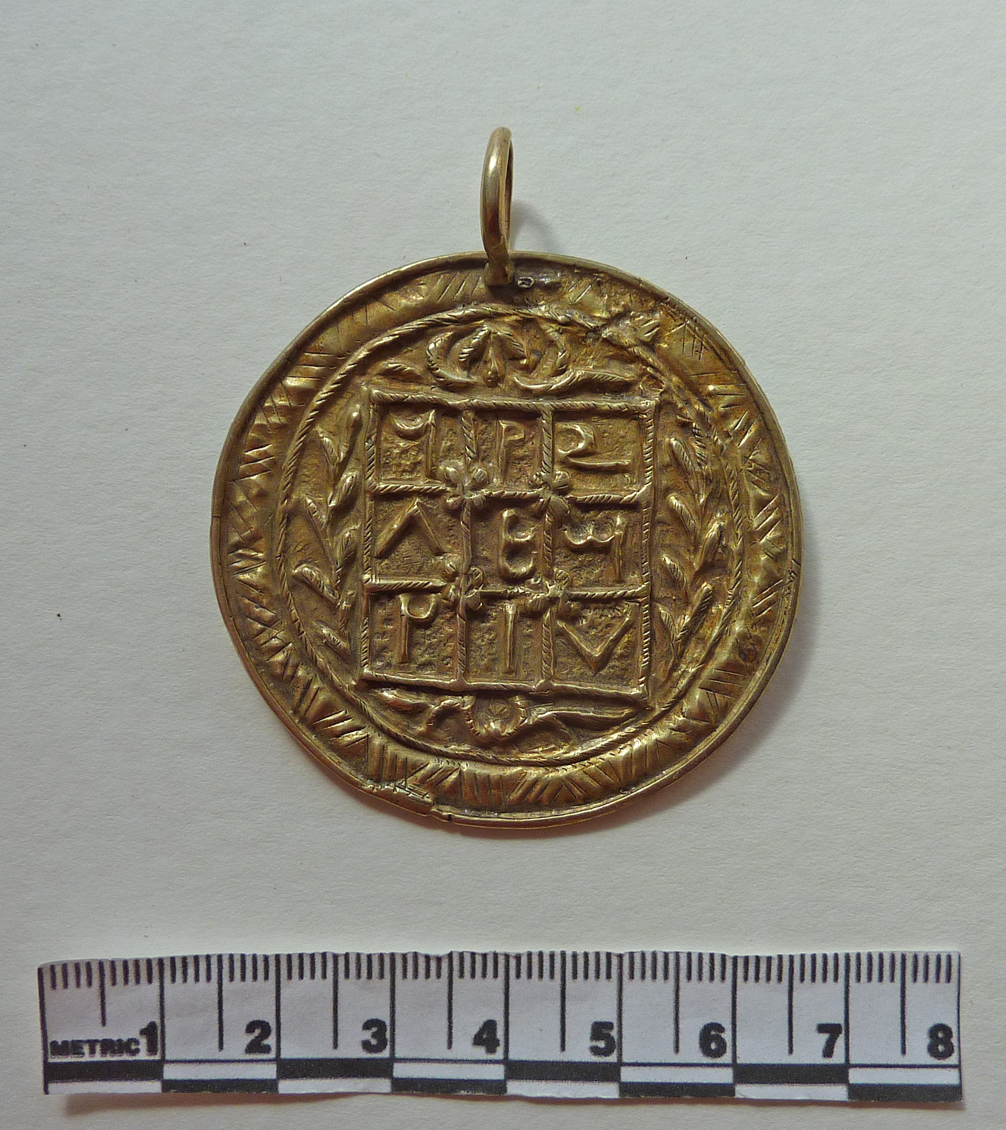Circular pendant with suspension ring at top. At the centre is a grid of nine squares each with a symbol inside it. A charm of the kind known as a taweez.