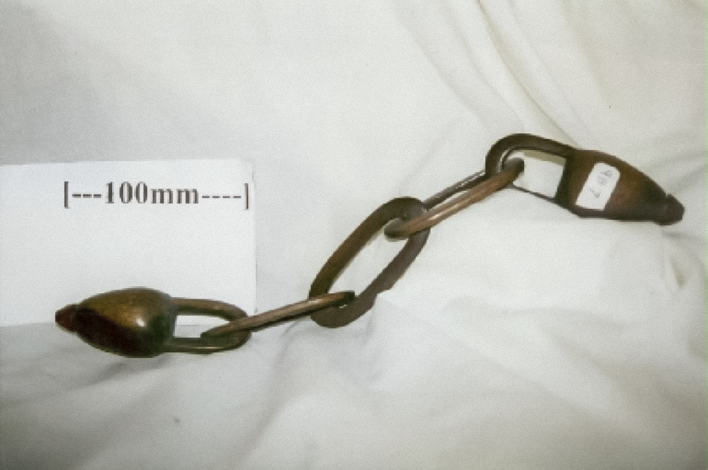 - Breast shapes linked by a chain, ingeniously carved out of a single piece of wood. The breasts are in fact small containers - the nipples unscrew.