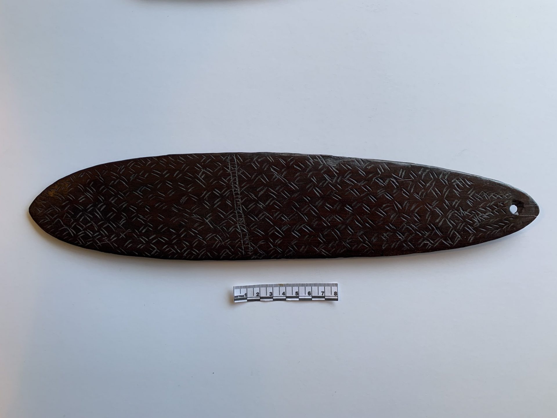 - Wind/Bull roarer, approximately 9" x 2" pierced at one end. Shallow carving of an angular design. smaller one 7" x 1.5" has spiral design Used for summoning spirits or raising spirit power.