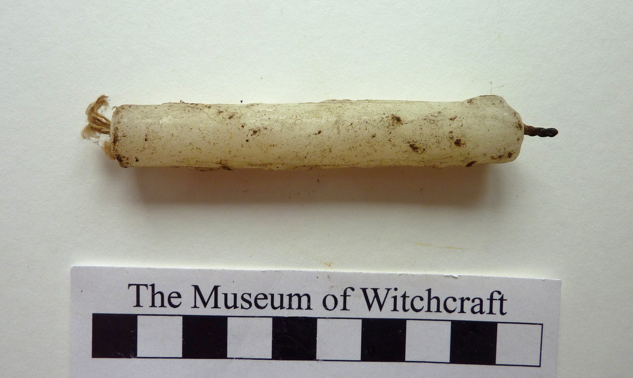 - A small white candle, partly burned. Part of it may have been cut off, as the wick is protruding from the unburned end.