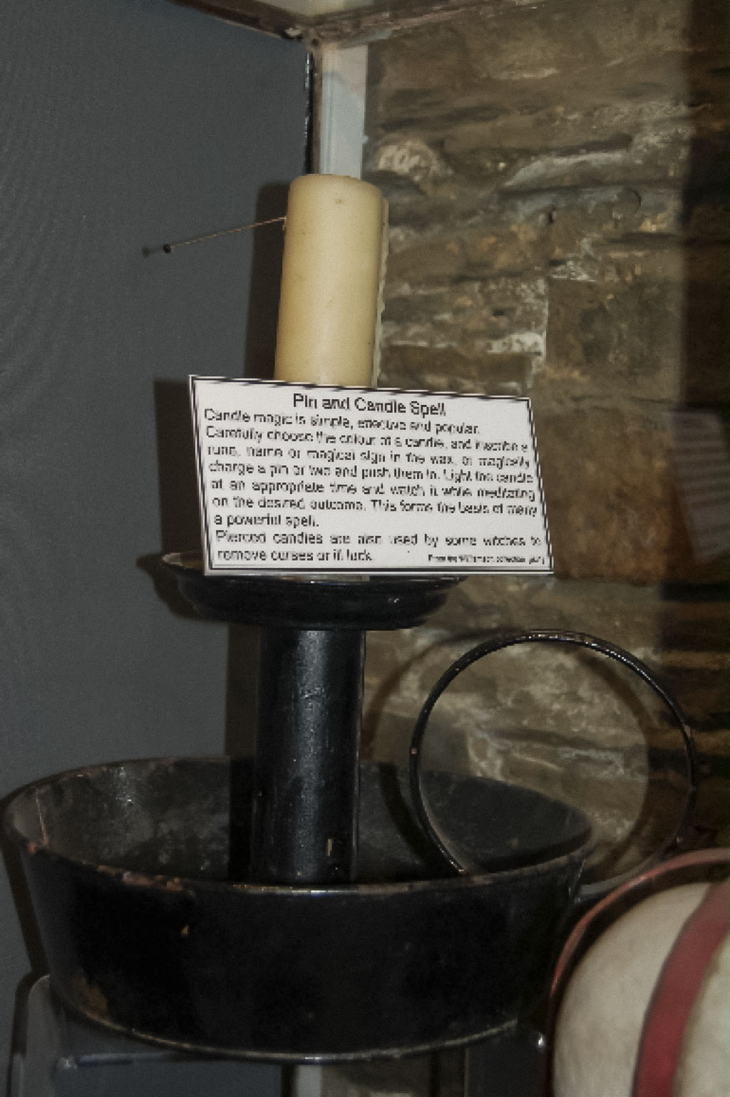 - A large discoloured white candle, with a long black-headed pin stuck in it, in a huge black metal candlestick with a round carrying handle.