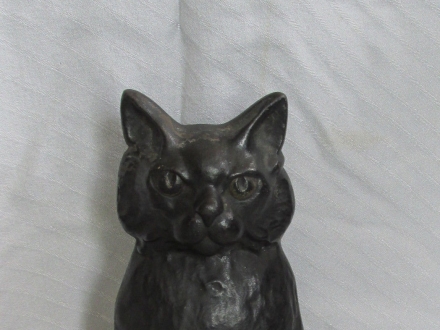 - A stylised figure of a cat, made from very heavy metal (bronze? cast iron?) with a black patina. The cat's back is slightly arched, and the tail slightly curved over the back, in a very evocatively cat-like pose.
