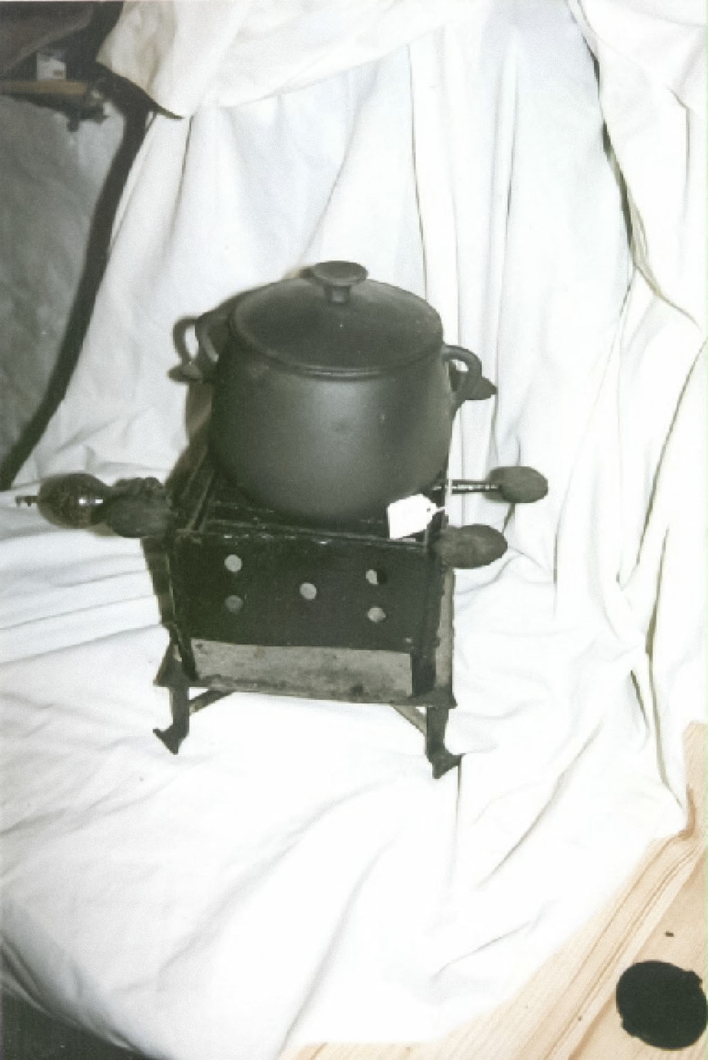 Possibly related to document 8080, which reads: "Small charcoal table brazier and iron pot of the type used by Dr. John Dee to melt the beeswax prior to pouring same to form the circular blanks on which he engraved his magical pentacles."