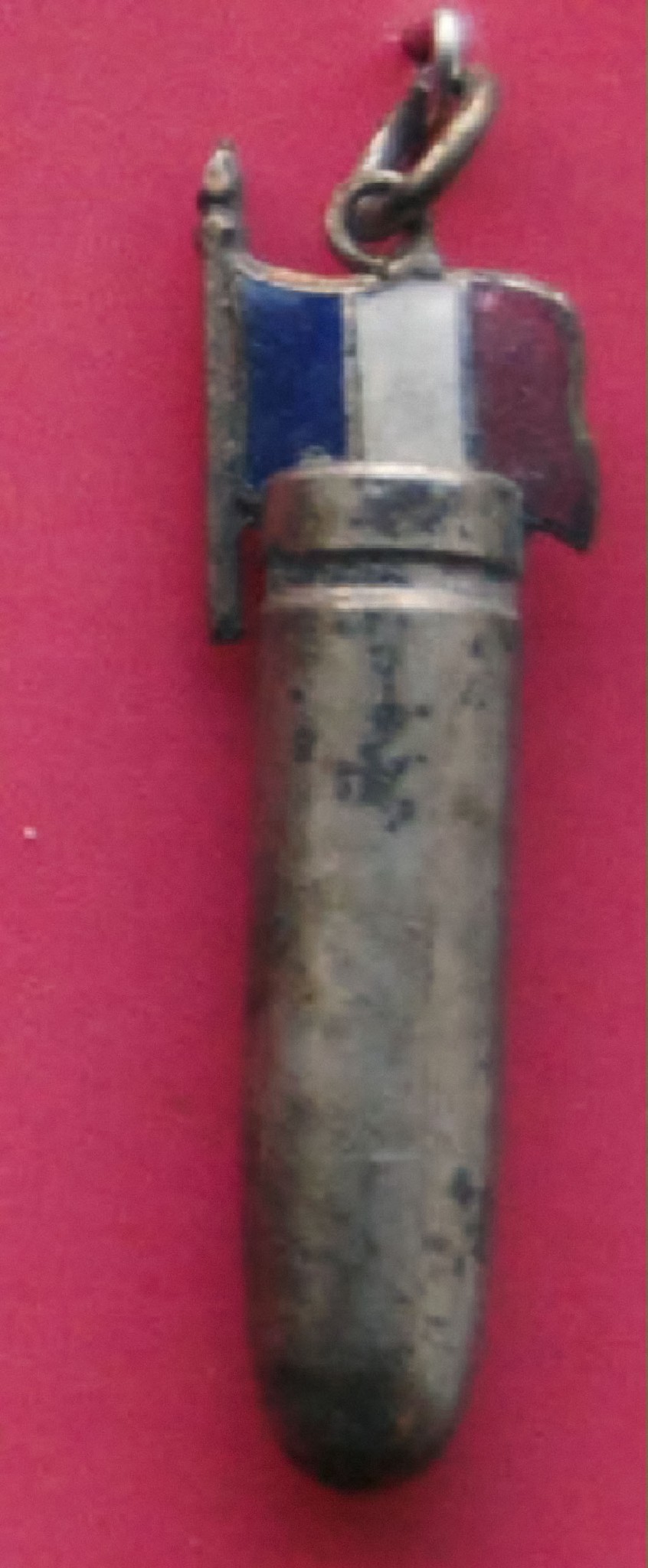 Trench Art charm a bullet with an enamel French flag attached to the top. With a ring for hanging.
