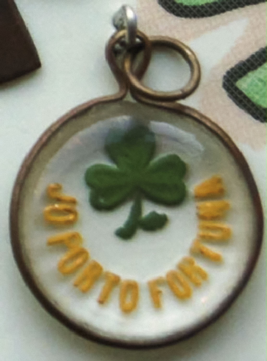 - Lucky charm - a clear glass disc, with an impression of a small shamrock leaf on the back, coloured green, plus the words 'JO PORTO FORTUNA' in yellow. With a copper mount.