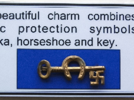 - Lucky charm - a clear glass disc, with an impression of a small shamrock leaf on the back, coloured green, plus the words 'JO PORTO FORTUNA' in yellow. With a copper mount.