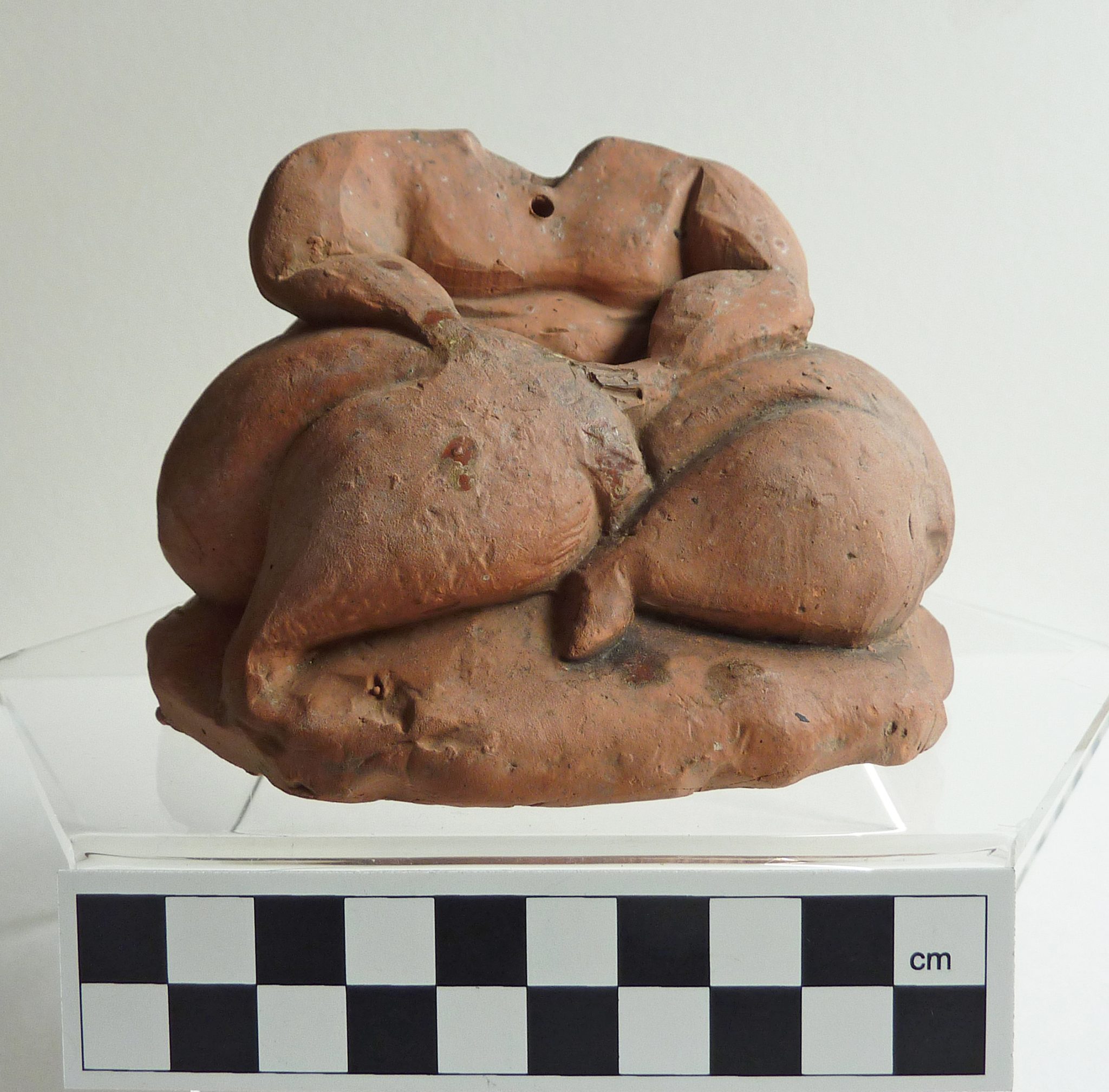- A stylised female figure (probably a Goddess) sitting with her legs under her and her hands on her legs. She is portrayed in a rounded form with exaggerated lower body, legs and arms, and small feet and hands. She has no head. Made from reddish clay or terracotta.