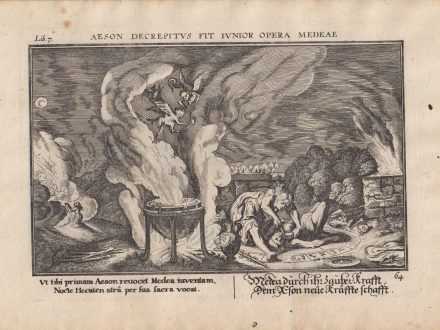 From Banier's Les metamorphoses d´Ovide. Main image shows Circe, an enchantress and witch of antiquity, turning the crew of Ulysses into pigs. Homer and Ovid tell the story of her feeding Ulysses' crew a potion and then turning them into swine by touching their hair with her wand.