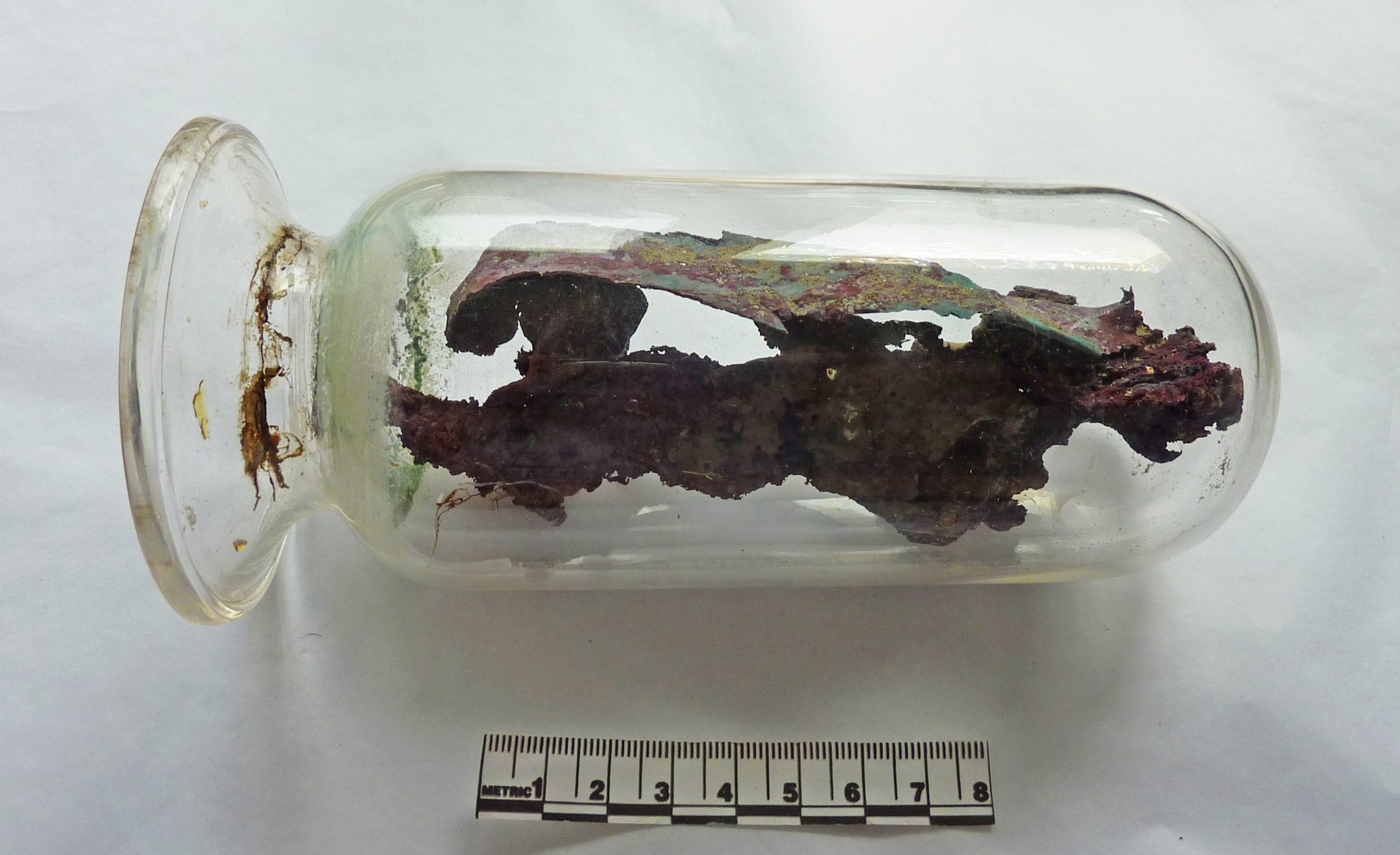Original text by Cecil Williamson: 'The spirit of copper captured and enclosed within this specimen glass container, once owned and exploited by Granny Wells of Redruth. With it she went around the mining areas in Cornwall divining for copper, pointing out places where copper might be found. The strange thing is that she made some good finds. The spirit in the glass container has long since gone. That is to say, the alcohol used to pressure this specimen has evaporated away. As for Granny Wells' conjured spirit of copper, who knows, it may still be with us within the glass container.'