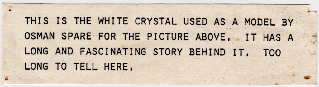 Cecil Williamson knew Kenneth and Steffi Grant.  He communicated with them by letter and collaborated with them on the Temple Room display in the Witches' Mill on the Isle of Man (see object number 941 - Double Cubic altar for more on this display).  Kenneth and Steffi were good friends of Austin Spare, helped him in his career and published his works.  They later worked with Robert Ansell and were key in ensuring Spare's reputation as an occultist and artist.  It is probably Cecil met Spare or acquired this crystal through his connections with the Grants.